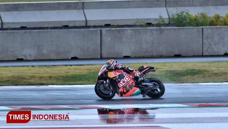 TIMES Boyolali/Pembalap tim Red Bull KTM, Miguel Oliveira melahap trek basah Sirkuit Mandalika, saat lomba seri kedua MotoGP di Mandalika, Lombok, NTB, Minggu (20/3/2022). (FOTO: Tria Adha/TIMES Indonesia)