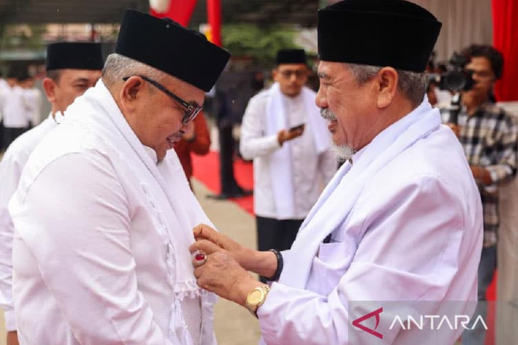 TIMES Boyolali/Pimpinan pesantren Insafuddin Banda Aceh memberikan kain kepada Sekda Aceh Bustami Hamzah usai peringati Hari Santri, di Banda Aceh, Selasa (24/10/2023). (FOTO: ANTARA/HO/Humas Pemprov Aceh)